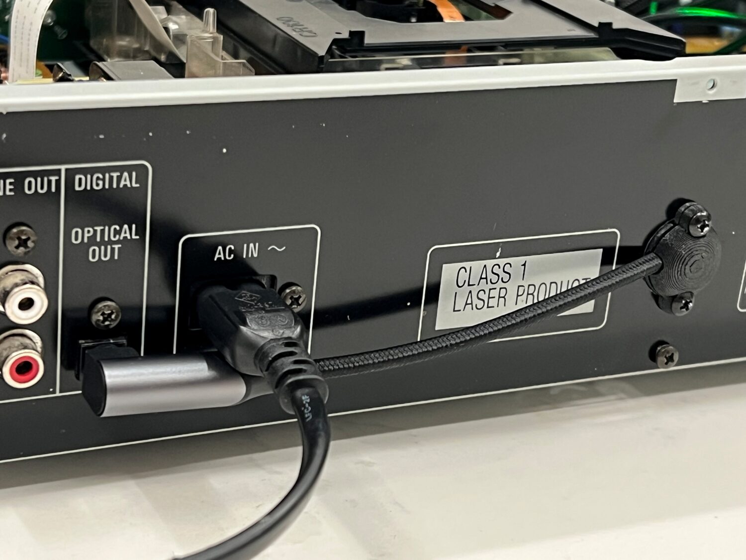 This build keeps the signal path clean (and reversible) by using the optical output. It means we have the optical cable connected to the original port then routed straight back into the machine through a grommet. The 3D printed grommet provides a smooth curve for the right-angle SPDIF cable: