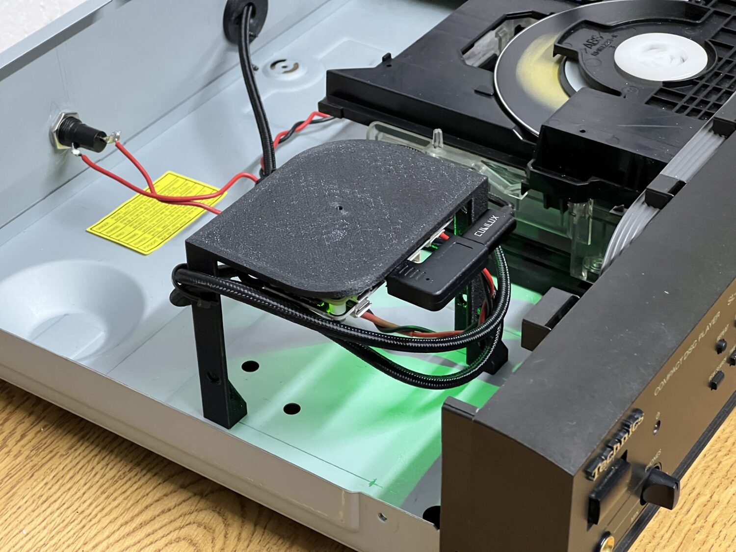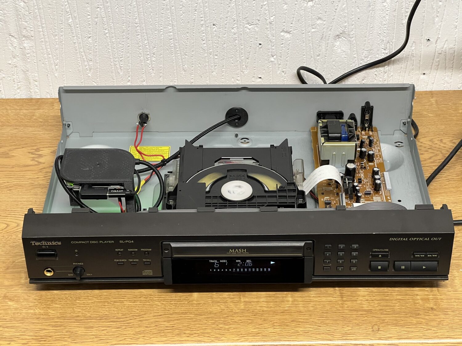 Thanks to owntone providing the AirPlay output and Technics thoughtfully providing their CD players with always-on PSUs and loads of space inside them, this project exactly preserves the way the CD player worked and adds multi-room WiFi streaming.